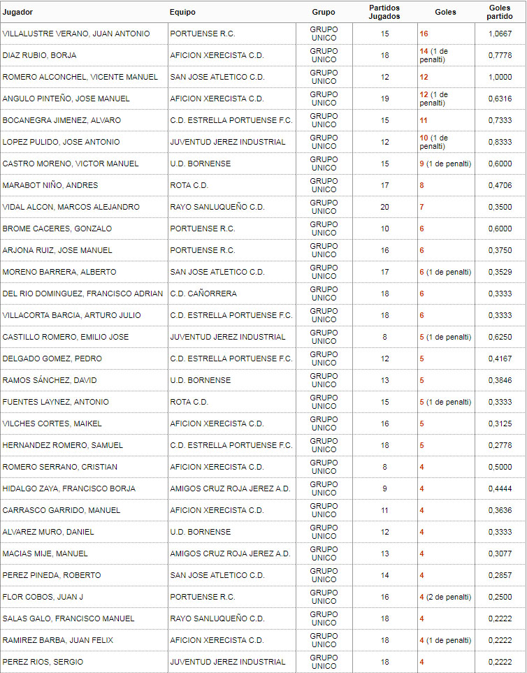 Por detrás del roteño, quedaron grandes goleadores como Borja Díaz (14 goles, 1 de penalti) de Afición Xerecista, Vicente Romero (12 goles) de San José Atlético y José Angulo (12 goles, 1 de penati) de Afición Xerecista.